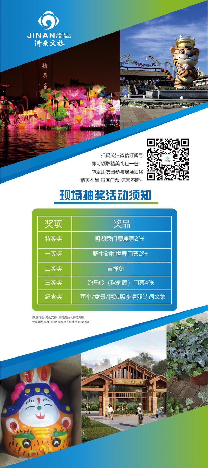 展会现场的抽奖活动最是诱人,通过扫描集团订阅号二维码即可领取精美礼包一份,转发朋友圈,参与现场抽奖活动,奖品有明湖秀观演坐票、济南野生动物世界门票、吉祥兔、跑马岭(秋菊展)门票、定制雨伞、盆景、精装版李清照诗词文集等,好礼多多,等您来!